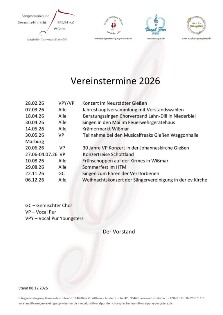 Sie lieben Musik und Gesang? Dann sind Sie bei uns genau richtig! Die Sängervereinigung Germania-Eintracht Wißmar ist ein traditionsreicher Chorverein mit drei lebendigen Chören für alle Altersgruppen. Ob bei unserem Gemischten Chor, Vocal Pur oder Vocal Pur Youngsters, bei uns finden Sängerinnen und Sänger jeden Alters eine musikalische Heimat.